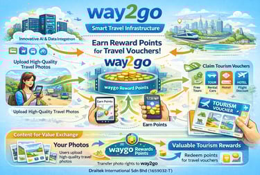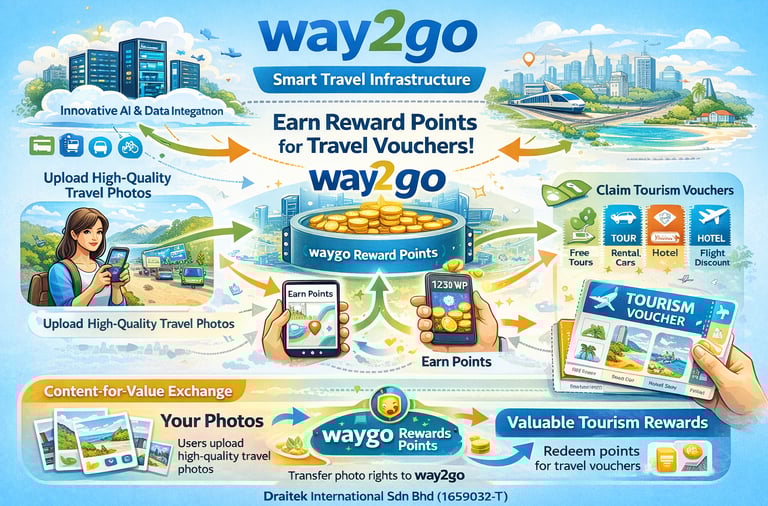 Users can contribute high-quality photos and earn Way2Go Reward Points. Points can be used toward tourism vouchers when certain levels/tier targets are achieved (subject to platform terms).